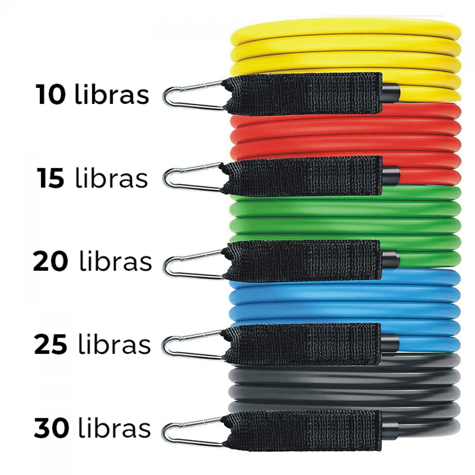 Set de teratubes de resistencia en TPE con diferentes niveles de tensión hasta 100 libras.  Incluye: dos agarres en lona con anclajes metálicos para pies, 1 anclaje para puertas, 2 agarres antideslizantes en espuma de alta densidad, 10 ganchos en acero inoxidable de alta resistencia y seguridad, 5 bandas en distintos colores y tula en poliéster para cargar el set completo.  Resistencia y colores de bandas: color negro 30 libras, color azul 25 libras, color verde 20 libras, color rojo 15 libras y color amarillo 10 libras. Longitud del cordón es de aproximadamente 110 cm. ------------------------------------------- Impresión: Screen  Tamaño Área Impresa : 10 x 10 cm -------------------------------------------- Caja: 67x30x38 cm. 20 unidades 13 KG