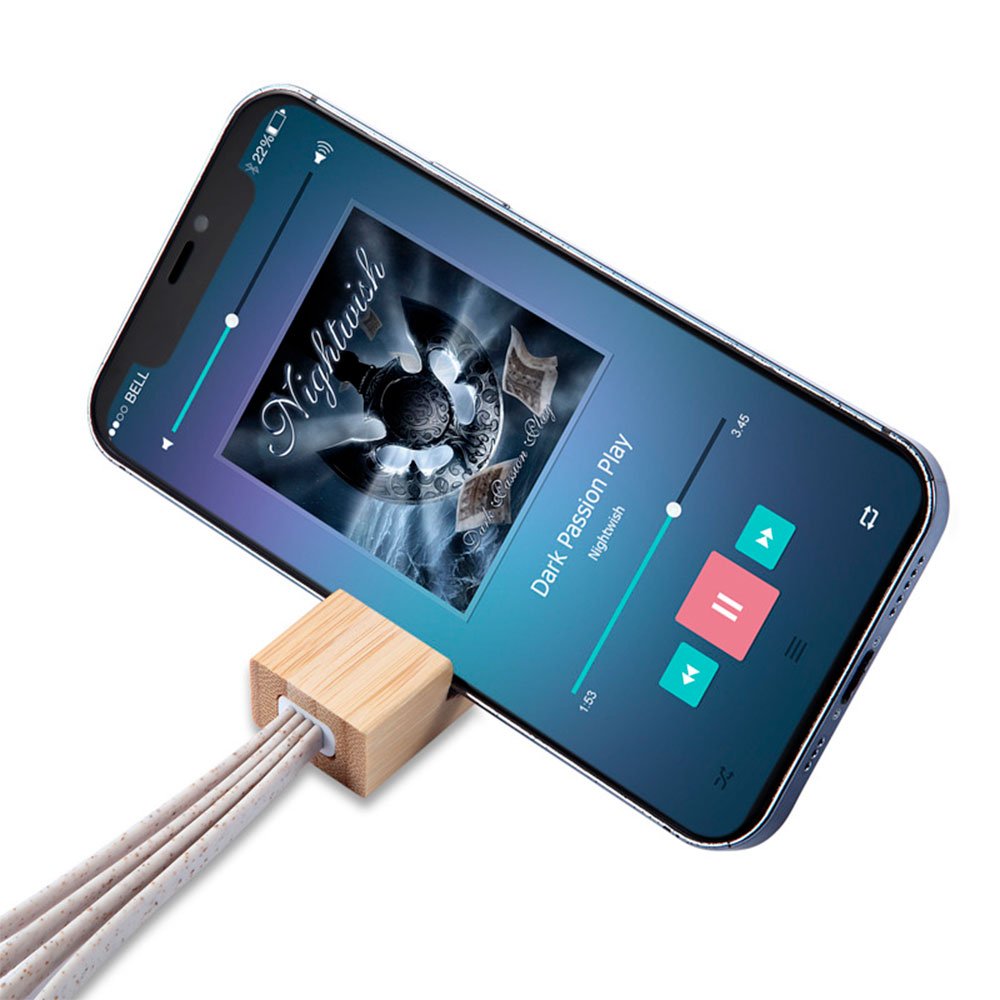 Set de carga tipo llavero con cable tipo C, Micro USB y Lightning. 5V DC 2.4A. Soporte para teléfono móvil. Fabricado en resistente bambú. De 2.7 x 15.5 x 1.5 cm -------------------------------------- Impresión: Tampografía o láser Tamaño Área Impresa: 2 x 2 cm. ----------------------------------- Caja:45x35x37 cm. 500 unidades 14 KG