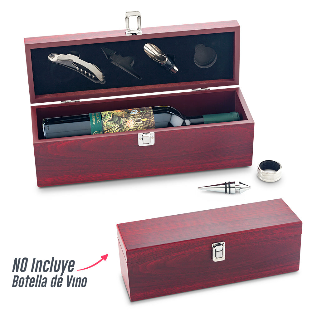 Estuche en madera con argolla antigoteo, 2 corchos, boquilla y descorchador con navaja de sierra y destapador. Espacio para una botella de vino. No incluye botella de vino. Empaque Caja Individual. Medidas: 33 cm x 11.5 cm Marca: 15 cm Láser Ficha Técnica
