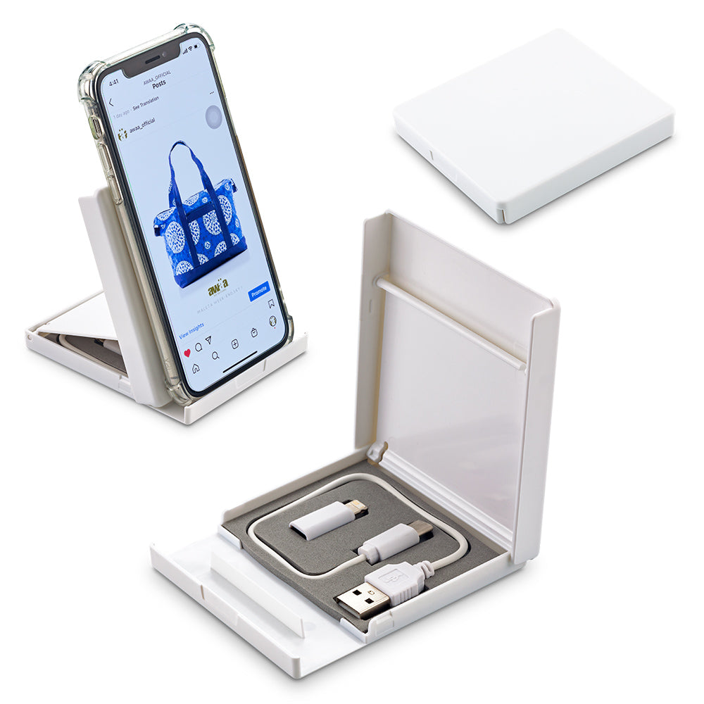 Soporte plástico portacelular con cable 2-1 y adaptador para tipo C. Medidas: 8 cm x 9.5 cm x 1.7 cm Marca: 5.5 cm Tampografía Ficha Técnica