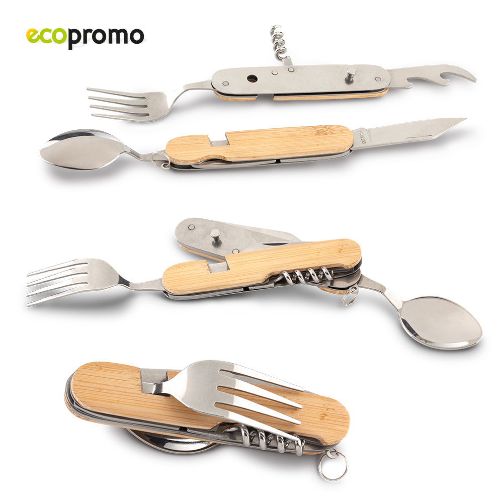 Set de cubiertos multifuncional de 6 funciones. Piezas en madera. Empaque caja individual. Medidas cerrado: 10.5 cm x 2 cm x 2.5 cm Marca: 3 cm Láser Ficha Técnica