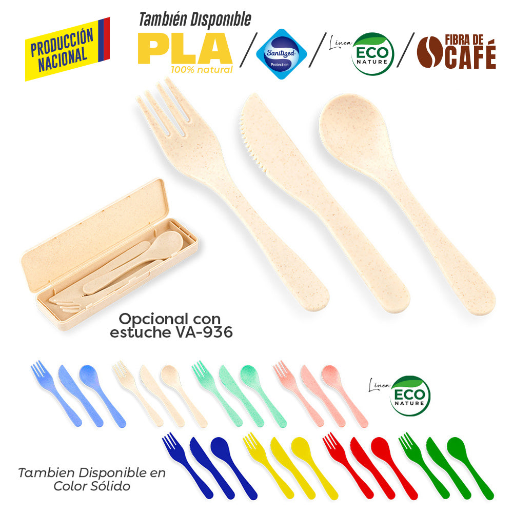 En plástico, incluye cuchara, tenedor y cuchillo. Se vende por set. Opcional solo polipropileno o con material ecológico de fibra de trigo. Mezcla con material ecológico en fibra de trigo 50-60 aprox. El porcentaje de material ecológico tiene un promedio de biodegradabilidad de 2-3 años después del fin de su vida útil. Medidas: 14.5 cm x 2.5 cm Marca: 2.5 cm Tampografía Opcional estuche Multiusos Space VA-936 Costo Adicional, Ver Aquí **Para el material en polipropilenofibra de trigo puede haber variación en el tono de los colores debido a la reacción del tipo de material y los colorantes usados en la fabricación** Producto con condiciones especiales de alistamiento, consulte con su asesora el tiempo de entrega. Ficha Técnica . set en colores sólidos . set en fibra de trigo . estuche adicional ver VA-936