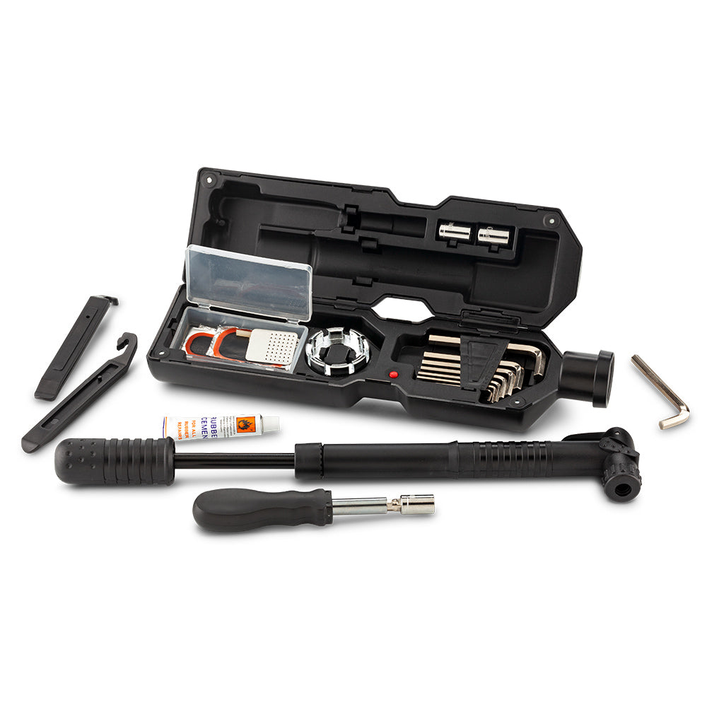 Set de herramientas de 30 piezas para bicicleta, en estuche plástico con linterna, 3 x AAA baterías no incluidas. Medidas: 29 cm x 7.8 cm diámetro Marca: 4 cm Tampografía Ficha Técnica