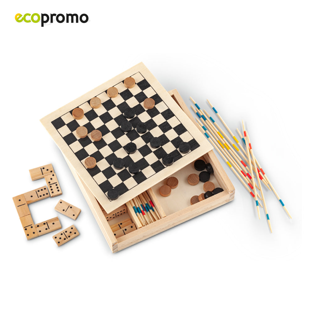 Set de juegos en madera. Incluye ajedrez, dominó, y palillos. Medidas Caja: 16.3 cm x 16.7 cm x 3 cm. Marca: 5 cm Láser. Ficha Técnica
