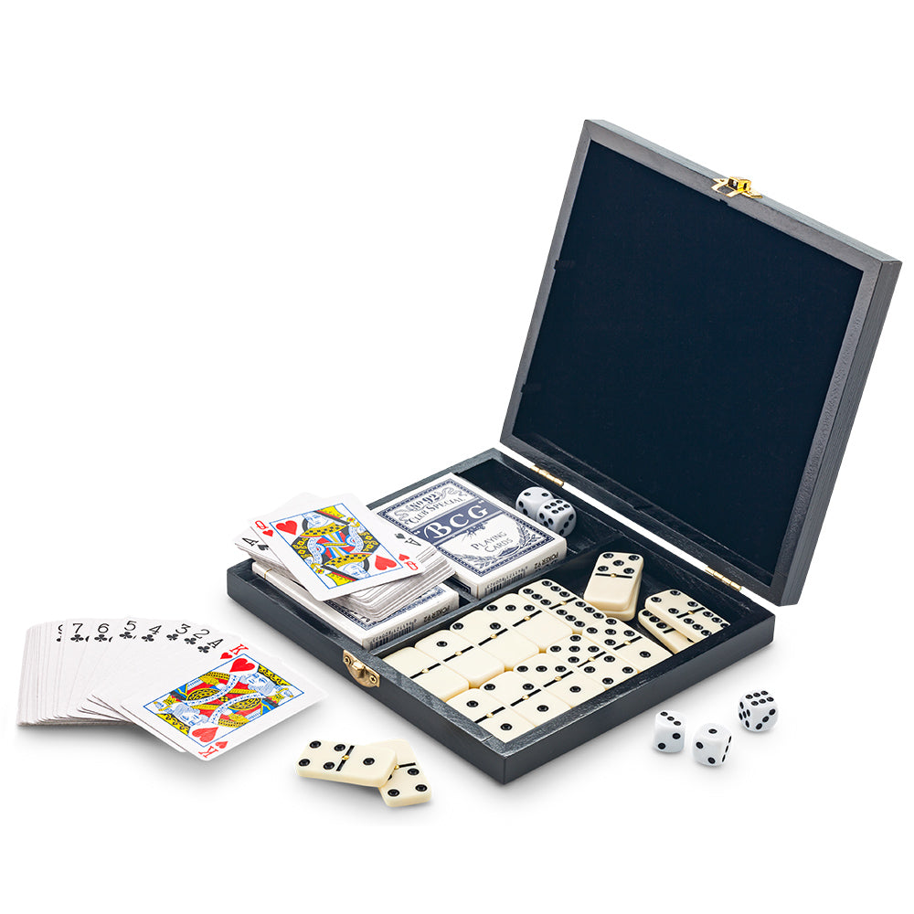 Estuche en madera con 5 dados, 2 juegos de cartas y dominó. Empaque caja individual. Medidas Estuche Cerrado: 21 cm x 19 cm x 3.3 cm Marca: 12 cm Láser en el estuche Ficha Técnica