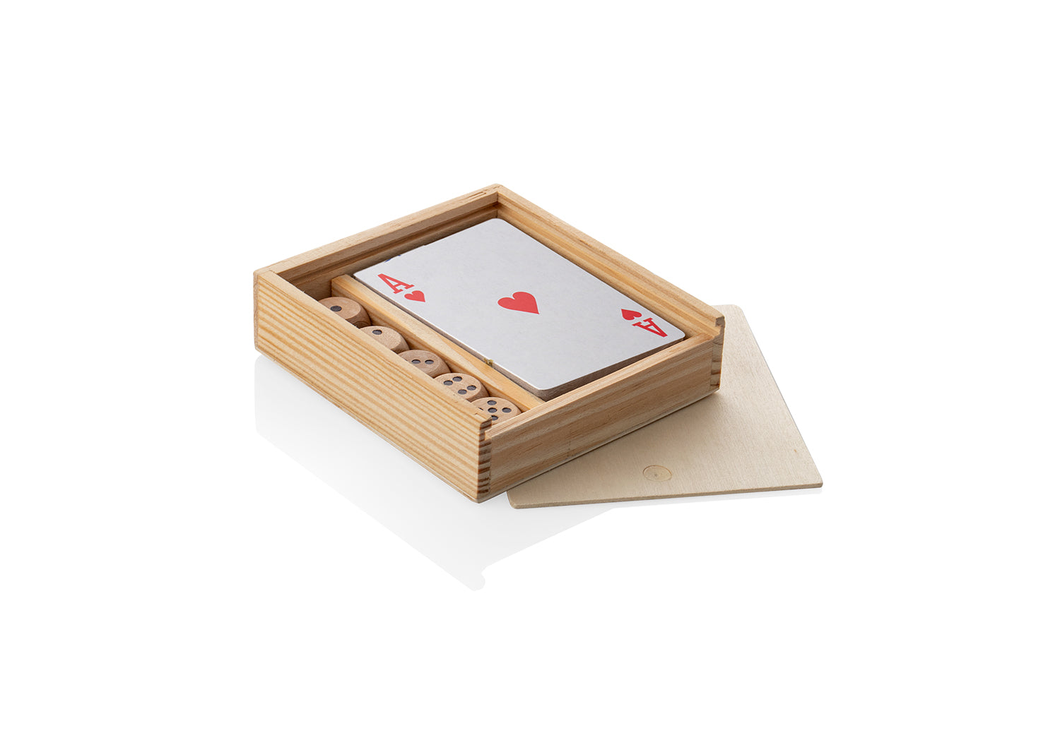 Estuche de madera con tapa deslizable que contiene un juego de cartas y 5 dados. Area impresion: Screen: 8 cm X 8 cm . Medidas Largo: 10.00 . Medidas Ancho: 9.00 . Medidas Alto: 2.50