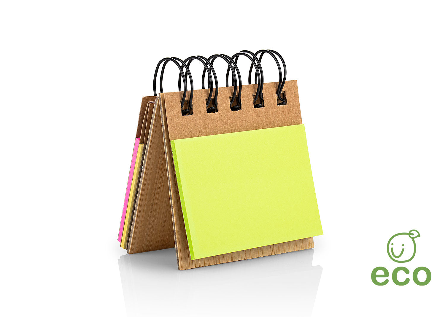 Set de memos con argollado doble O y cubierta en Bambú. 3 set de memos adhesivos por 40 hojas y 5 colores de banderas en papel x 25 unidades cada color.. Area impresion: Láser: 3X3 cm. Tampo: 4cm