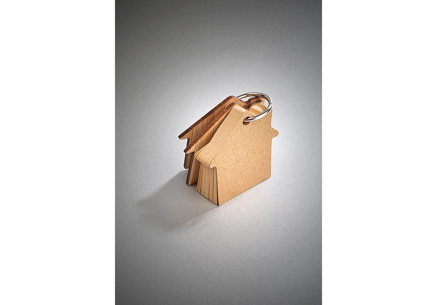 Llavero de bambú con 80 hojas de memos adhesivos en papel reciclado color natural en forma de casa.. Area impresion: 3X3 cms . Medidas Largo: 5.00 . Medidas Ancho: 5.00 . Medidas Alto: 1.00