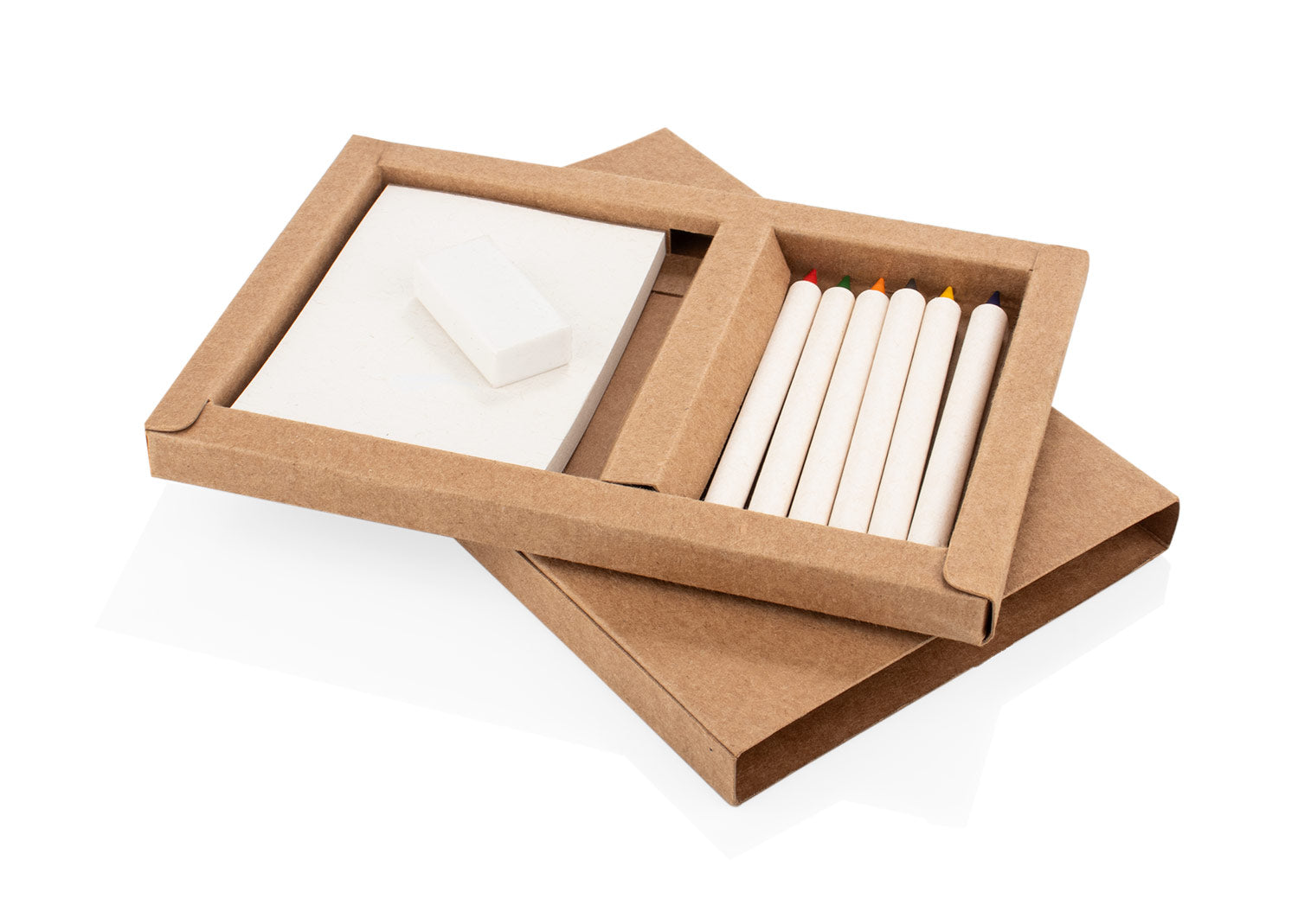 Set de 6 lápices de colores amarillo, rojo, naranja, verde, negro, azul oscuro hechos en cartón tipo leche 9 X Ø 0,5, 1 borrador 1,8 X 3,5 X 1 y 1 bloc de notas de 60 hojas con diseño a juego 6,5 X 8,9 X 0,6.. Area impresion: Tampo: (7 X 4). . Medidas Largo: 1.5 . Medidas Ancho: 16.7 . Medidas Alto: 11.3