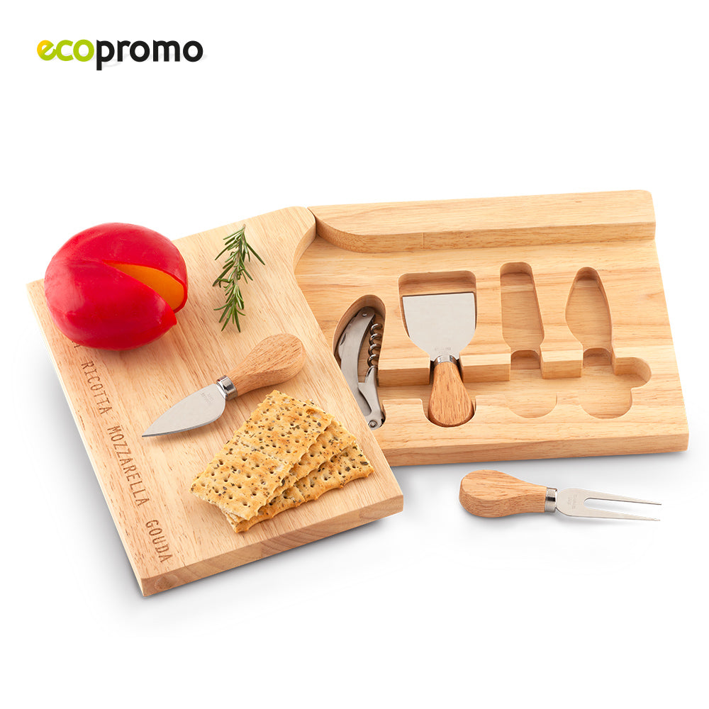 Set de madera para quesos, tabla y cuatro accesorios. Empaque caja individual. Medidas: 26 cm x 20 cm x 3.7 cm Marca: 10 cm Láser