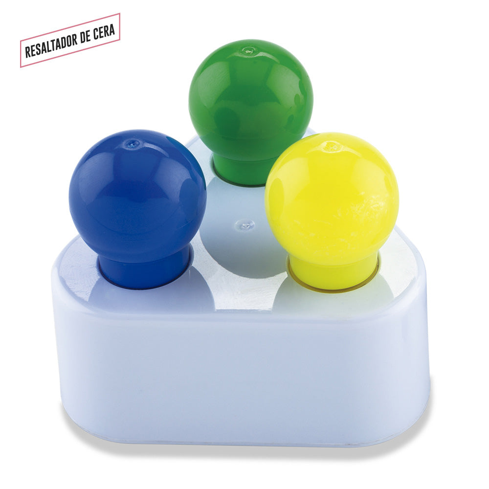 Base triangular en plástico, con 3 resaltadores en cera. No se seca. Medidas: 6 cm x 5.5 cm Marca: 4 cm Tampografía Ficha Técnica