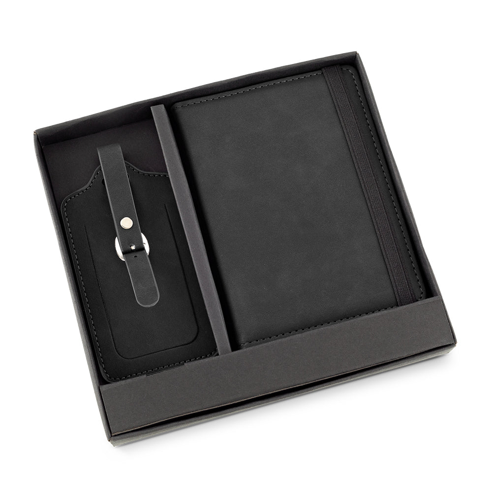 Set de portapasaporte e identificador de maletas en poliuretano. Con 4 portatarjetas, un portadocumentos y dos porta SIM no incluidas. Empaque Individual. Medidas Caja: 19.5 cm x 18 cm x 2.5 cm. Marca: Portapasaporte: 6 cm Tampografía Identificador: 3.5 cm Tampografía. Ficha Técnica