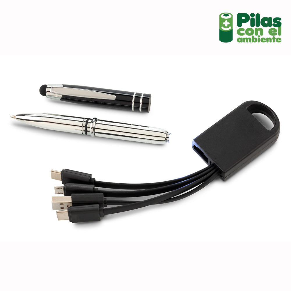 Set multifunción para viaje. Incluye una pila recargable de 2200 mAh para teléfonos móviles, un cable muticargador con conectores 2-1 micro y lighting, Tipo C y Tipo USB, un bolígrafo roller plástico con stylus y un Cargador Tipo USB. Estuche rígido en poliuretano. Empaque caja individual. Medidas Estuche: 16 cm x 12 cm x 5 cm. Marca: 5.5 cm Tampografía.