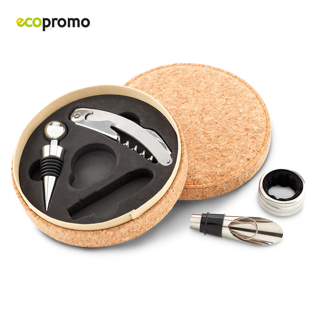 Estuche rígido en corcho con argolla antigoteo, corcho, boquilla y descorchador con navaja de sierra y destapador. Empaque Caja Individual. Medidas Estuche: 4 cm x 14.7 cm diámetro Marca: 5 cm Láser Ficha Técnica