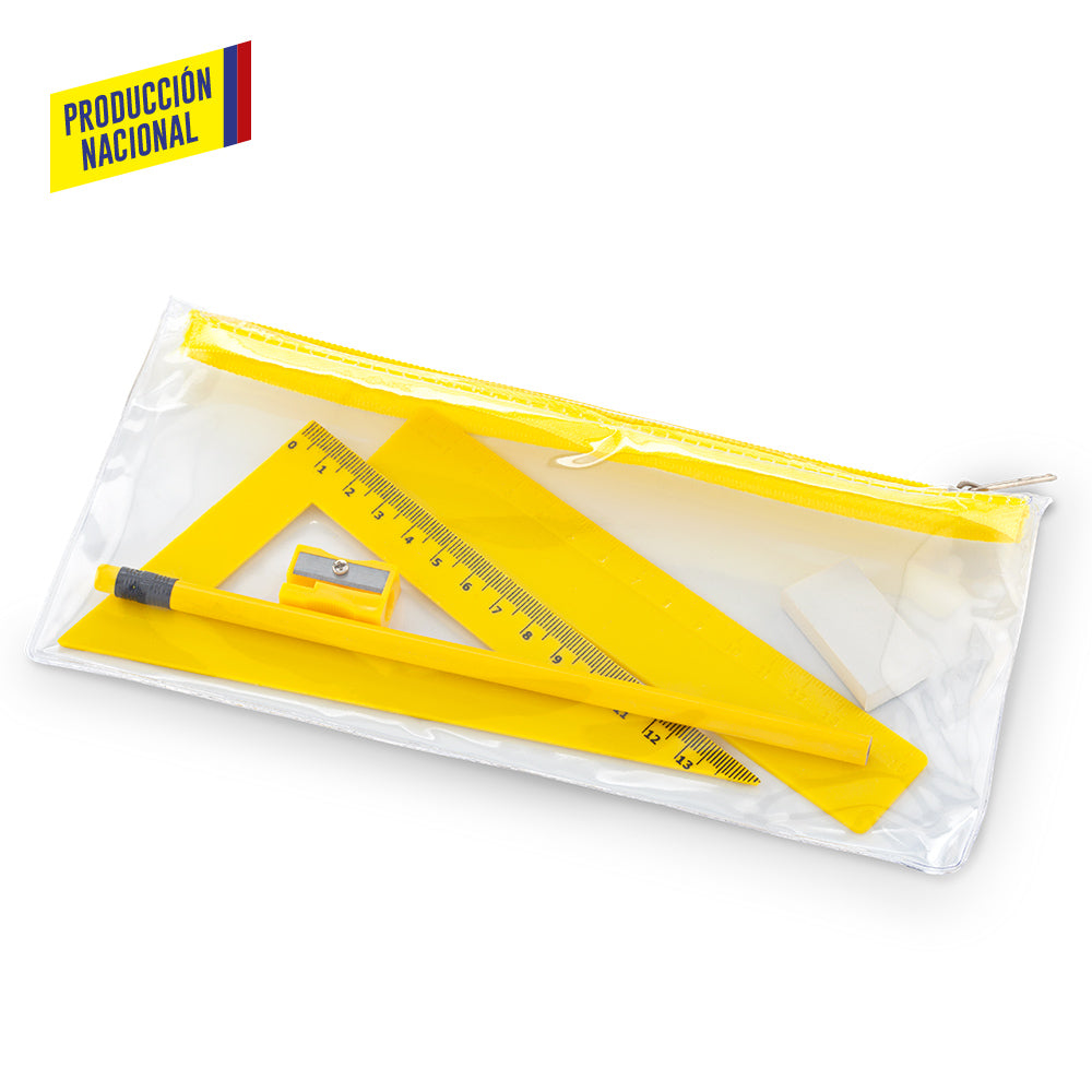 Set escolar en cartuchera plástica PVC con cierre de cremallera. Incluye: Lápiz, tajalápiz , regla de 15cm, escuadra de 15cm y borrador Medidas: 9.8 cm x 22.5 cm Marca: 6 cm Screen