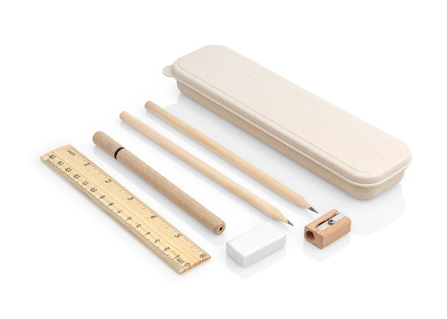 Set de escritorio en estuche en Paja de trigo. Incluye bolígrafo con tapa y tinta negra, borrador, 2 lápices, tajalápiz y regla de 15 cm 6 pulgadas.. Area impresion: Tampo: 7 cm x 4 cm . Medidas Largo: 2.00 . Medidas Ancho: 5.50 . Medidas Alto: 2.50