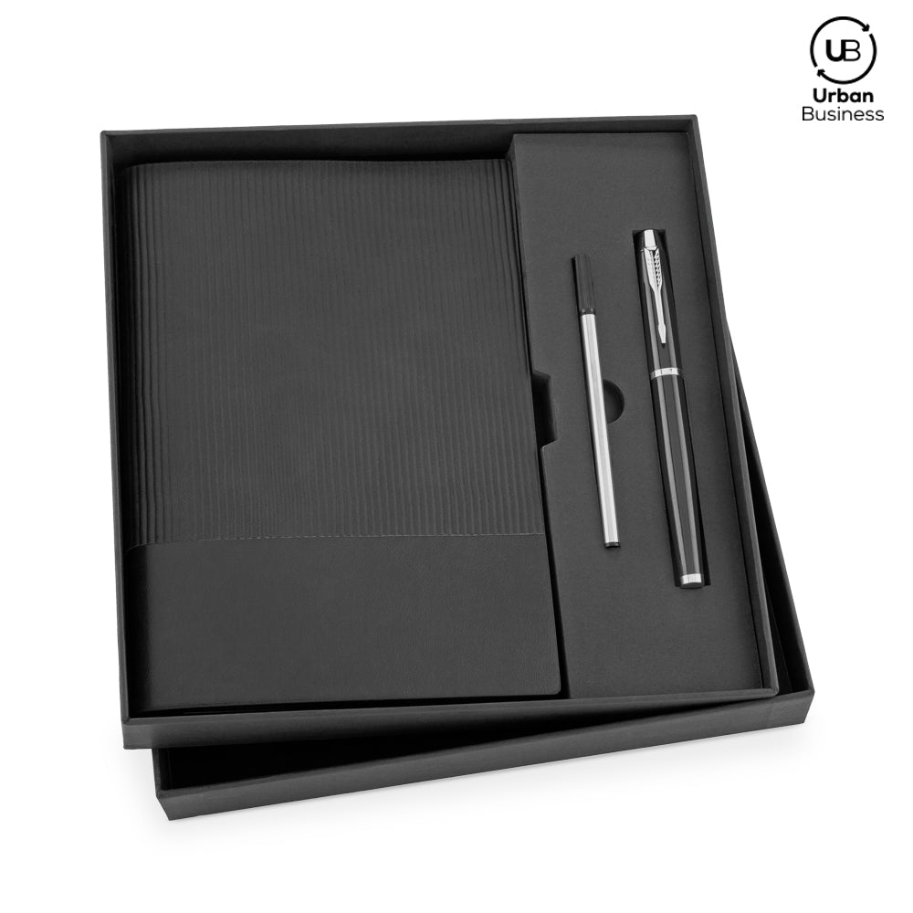 Set de libreta de 21 cm x 14.5 cm de 96 hojas rayadas con cubierta en PU, bolígrafo metálico roller y repuesto de mina. Empaque caja individual. Medidas Caja: 23 cm x 23 cm x 3.7 cm. Marca: Libreta: 4 cm Screen.Bolígrafo: 3.5 cm Láser.
