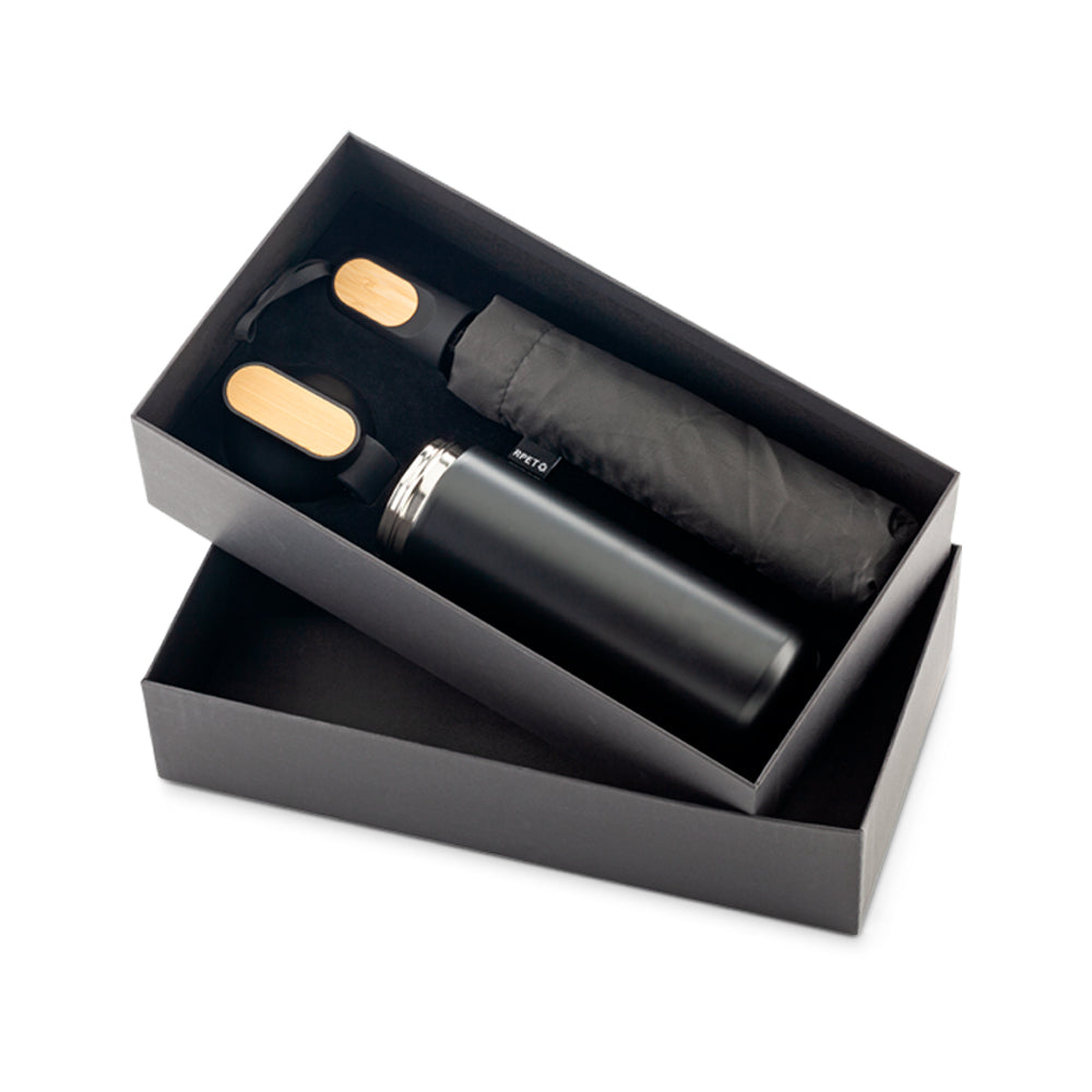 Set ecológico de botilito doble pared vacuum en acero inoxidable reciclado, con aislamiento térmico que mantiene la bebida fría o caliente hasta 6h, aprox puede variar dependiendo condiciones climáticas. Con tapa rosca y detalle en bambú y Mini paraguas de 21 en poliéster reciclado RPET, con apertura automática, mango en caucho, herraje metálico. Con forro. Empaque caja individual. Medidas: Caja: 33.5 cm x 18.4 cm x 9.4 cm. Marca: Sombrilla: Máximo: 20 cm Screen. Botilito: 4 cm Tampografía Láser. Ficha Técnica