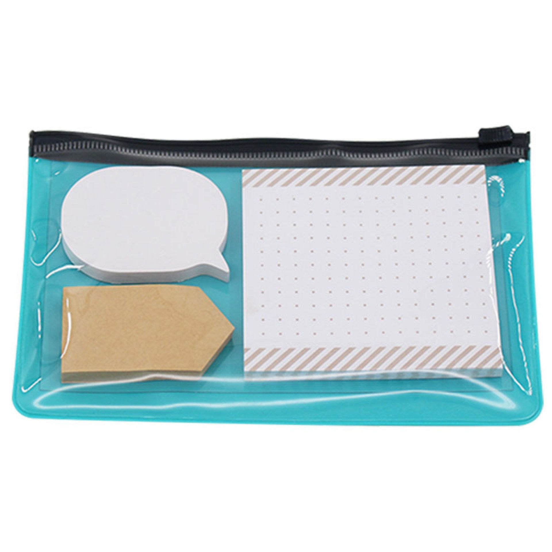 Set con tres tacos de papel adhesivos en cartuchera de PEVA con cremallera sellable. De 15 x 10 cm. ------------------------------------- Impresión: Tampografía o screen Tamaño Área Impresa: 13 x 8 cm. -------------------------------------- Caja: 38x35x33.5 cm. 240 unidades 15 kilos