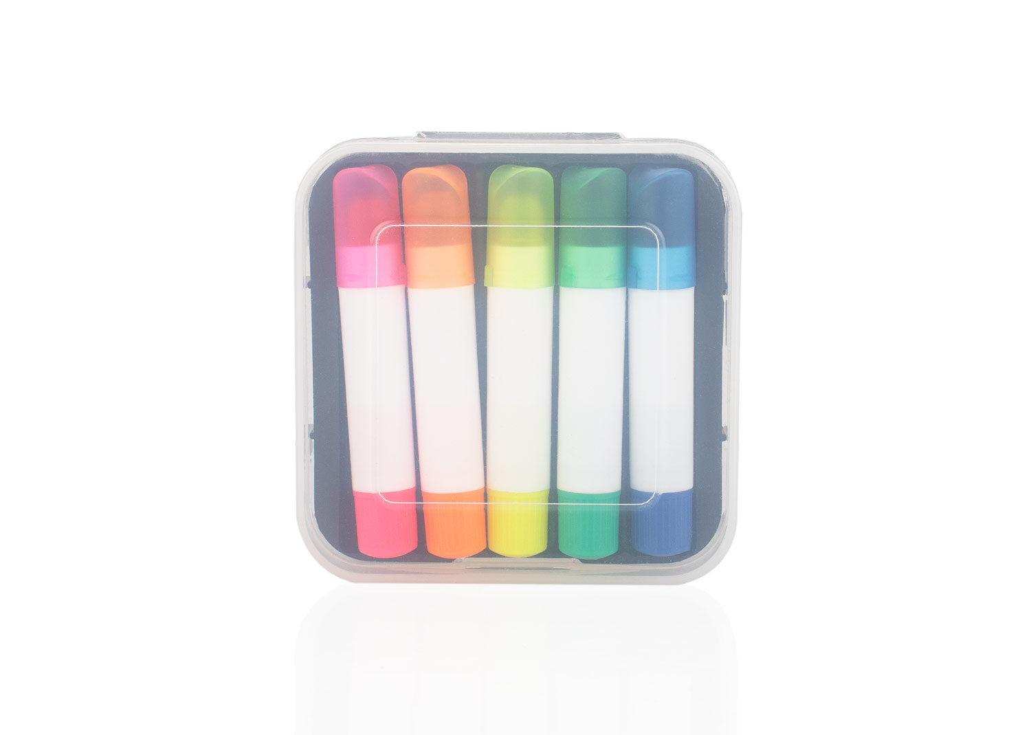 Set de resaltadores en parafina por 5 unidades en estuche plástico. Sistema Twist. No se secan.. Area impresion: Impresión Digital: Estuche: 5 x 5 cm. Tampografía: Estuche: 4 x 2 cm. Resaltador: 2,5 x 0,5 cm. . Medidas Largo: 2.4 . Medidas Ancho: 9 . Medidas Alto: 8.8
