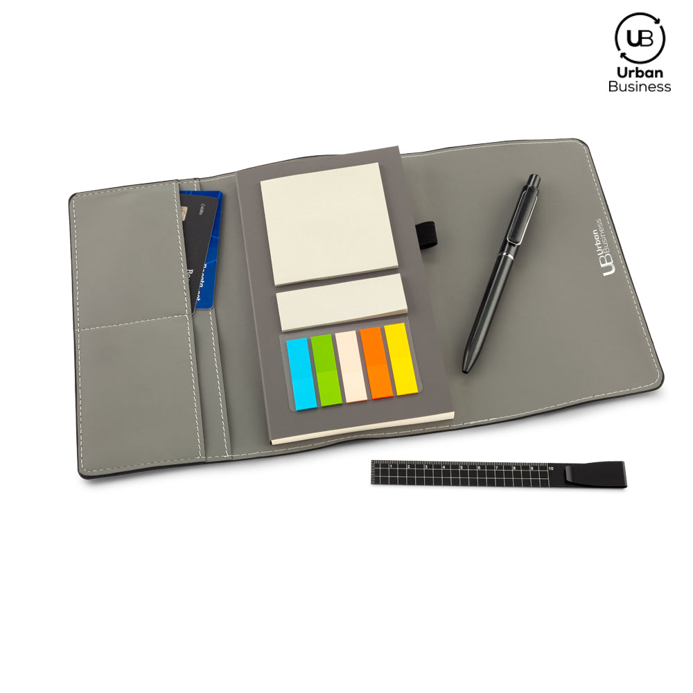 Set de estuche en poliuretano con libreta de 70 hojas rayadas de 18.5 cm x 10.5 cm, 6 stickies en colores surtidos, 1 taco de papel y 3 bolsillos internos portadocumentos. Cierra elástico. Un bolígrafo plástico con mecanismo push. Una regla - clip metálica de 10 cm. Empaque caja individual.  Medidas Caja: 21.2 cm x 21.2 cm x 3 cm. Marca: Estuche: 7 cm Screen Repujado. Bolígrafo: 3 cm Tampografía. Ficha Técnica