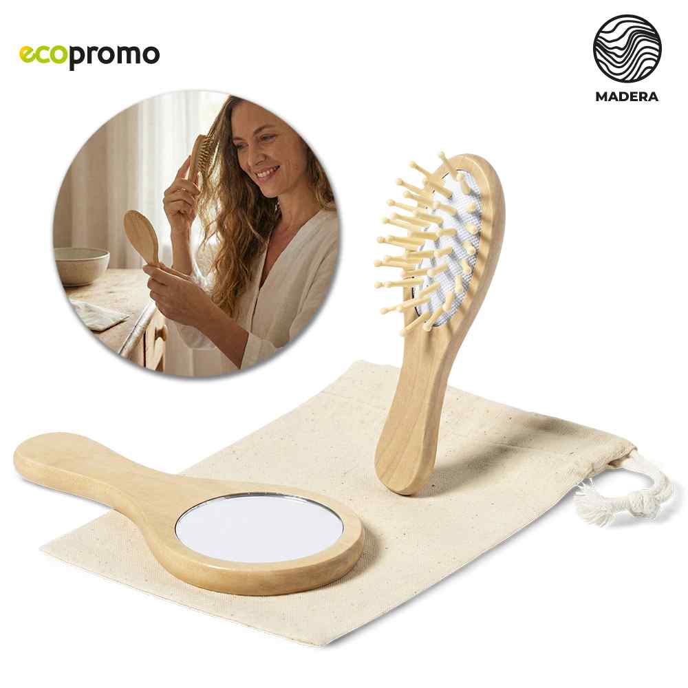 Set de espejo y cepillo en madera natural. Con bolsa en algodón. Artículo para uso personal, no se admiten Cambiosdevoluciones. Empaque bolsa individual Medidas Bolsa: 18 cm x 12 cm. Marca: Bolsa: 5 cm Screen Cepillo - Espejo: 4 cm Láser. Ficha Tecnica