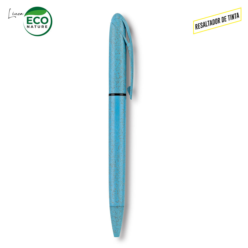 Boligrafo plastico con resaltador de tinta. Mecanismo twist. Mezcla con material ecologico en fibra de trigo 50 aprox. El porcentaje de material ecologico tiene un promedio de biodegradabilidad de 2-3 anos despues del fin de su vida util. Medidas: 14.5 cm . Marca: 4 cm Tampografia
