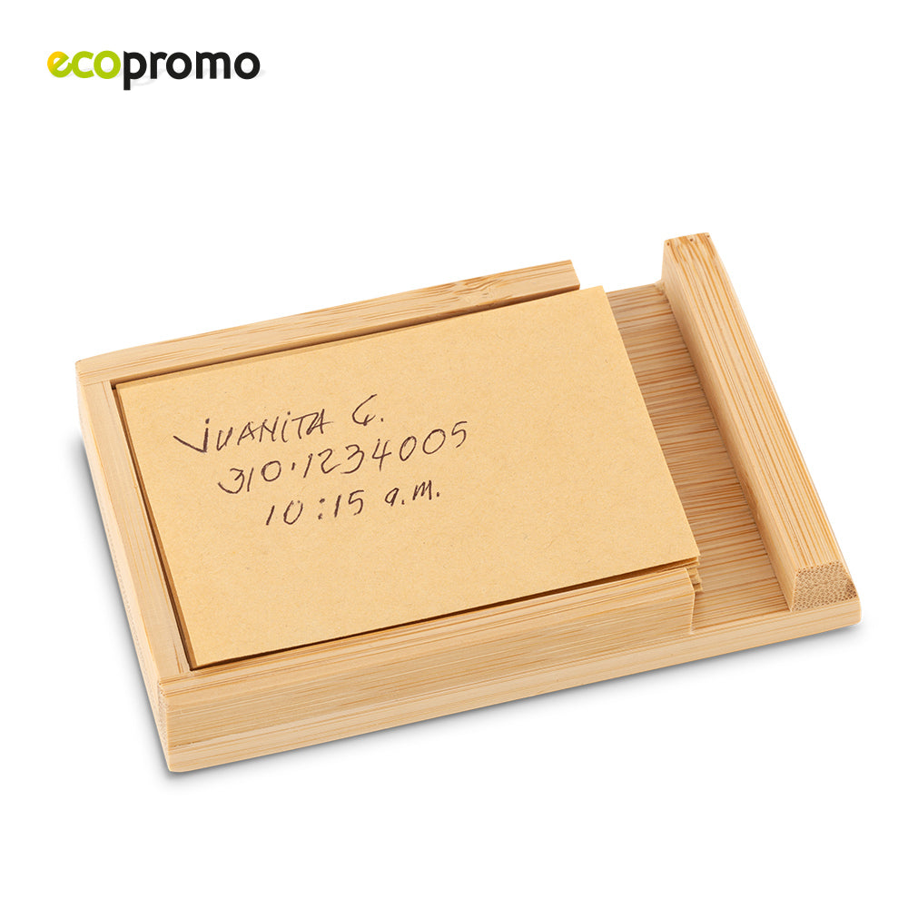 Soporte para móviles en bambú con portanotas. Incluye 80 hojas recicladas. Medidas: 7 cm x 11 cm x 2 cm Marca: 2.5 cm Láser