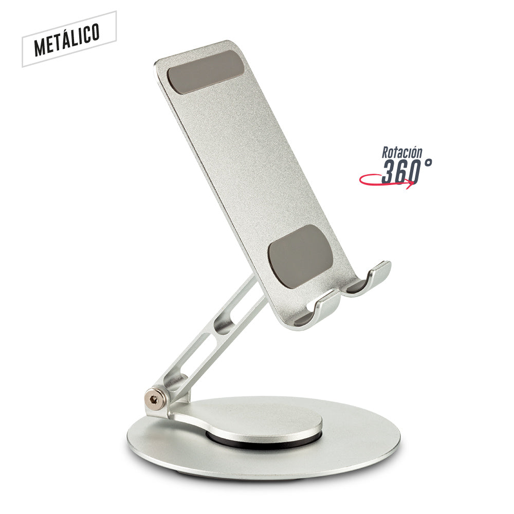 Soporte metálico plegable y escualizable con rotación de 360°. Accesorios antideslizantes en silicona. Empaque caja individual. Medidas Cerrado: 10.5 cm de diámetro x 2 cm Marca: 3 cm Láser