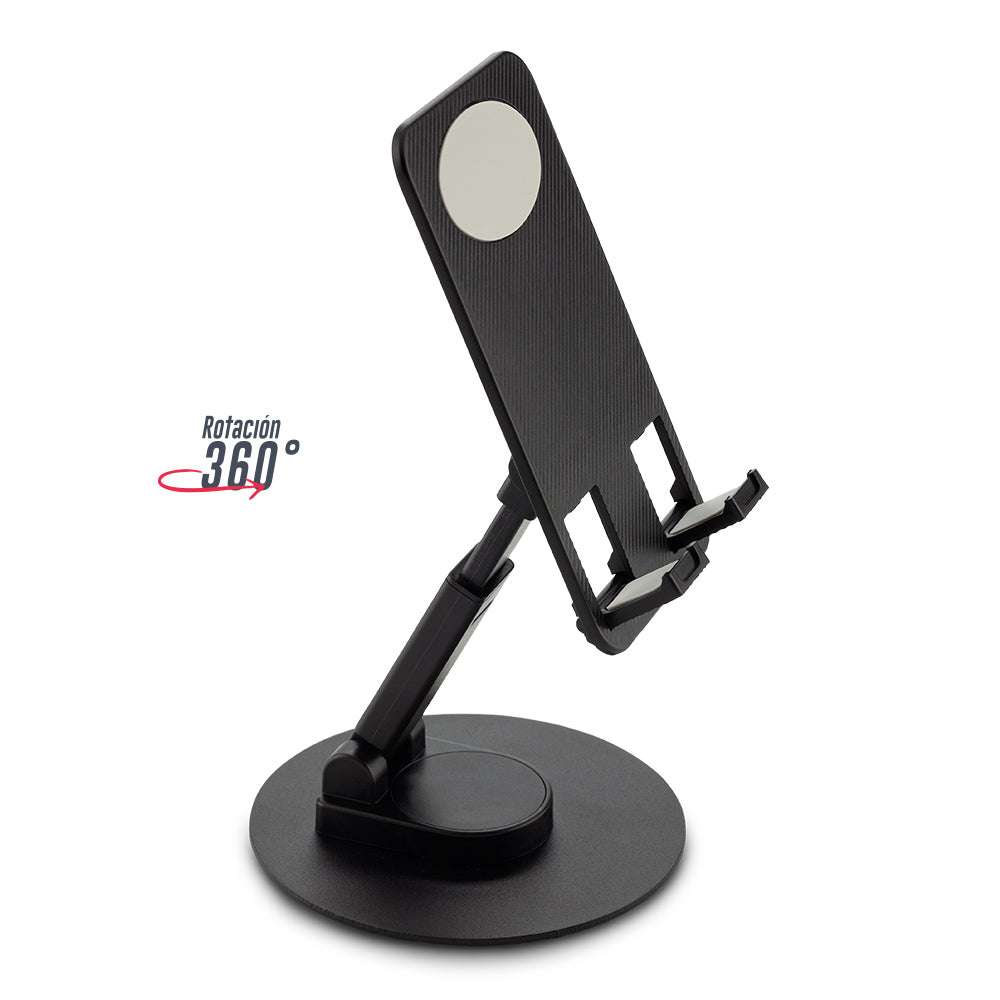 Soporte plástico, plegable y escualizable con rotación de 360°. Accesorios antideslizantes en silicona. Empaque caja individual. Medidas Cerrado: 10 cm x 13.5 cm x 2.5 cm Marca: 4 cm Tampografía