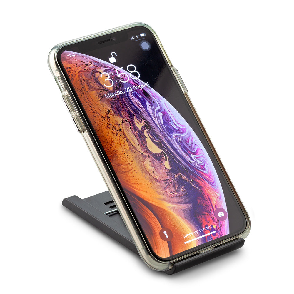 Soporte Portátil plegable plástico. Ligero, con ajuste de altura en la parte posterior y puntas antideslizantes. Se sugiere usar en dispositivos de hasta 7 pulgadas. Empaque caja individual. Medidas Cerrado 12 cm x 4.9 cm x 1 cm Marca: 2.5 cm Tampografía