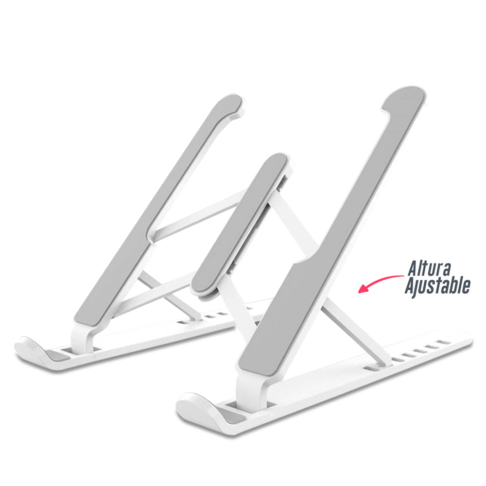 Soporte Portátil Plegable plástico. Ligero, con ajuste de altura en la parte posterior y puntas antideslizantes. La posición del dispositivo sobre el soporte ayuda a que no se recaliente, mejora la posición de la columna vertebral y reduce la fatiga de cuello, espalda y ocular. Se sugiere usar en dispositivos entre 10 y 15 pulgadas. Con funda para cargar y caja individual. Medidas: 26.5 cm x 6 cm x 2 cm Marca: 5 cm Tampografía Ficha Técnica
