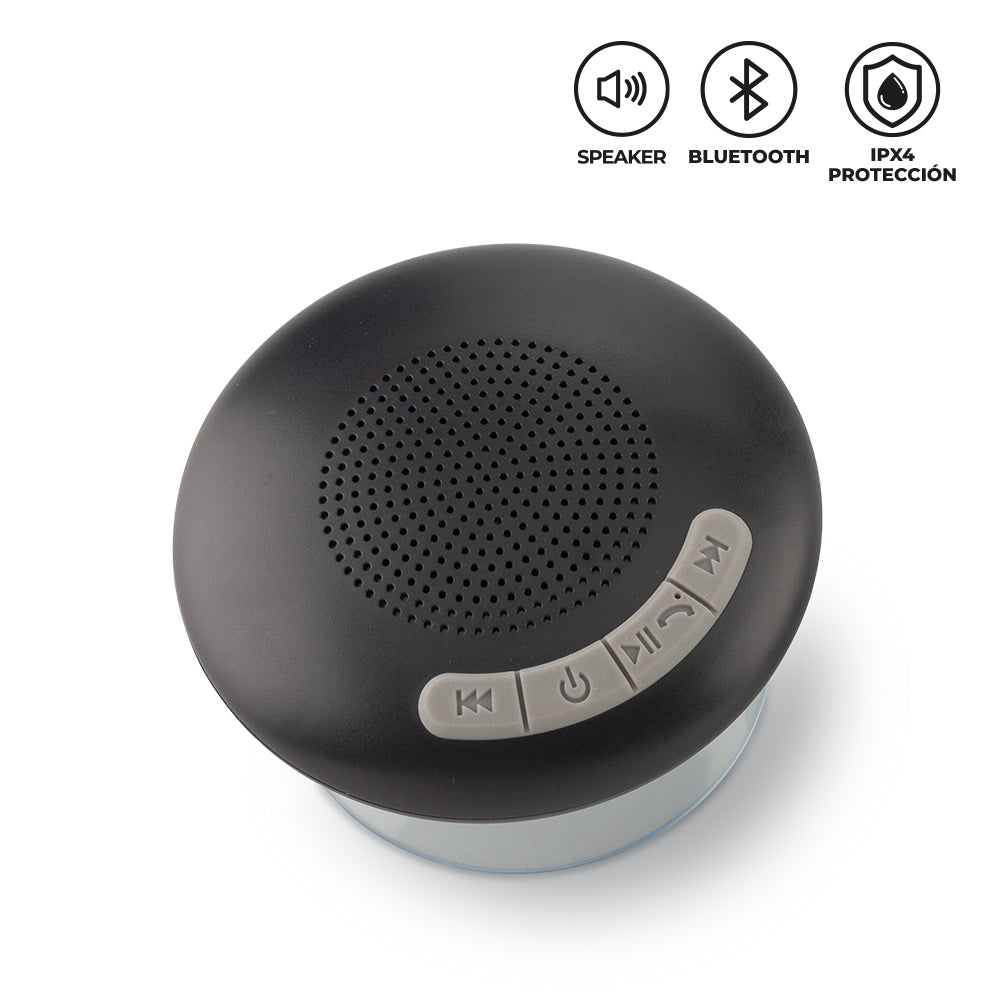 Speaker Bluetooth plástico con chupa. Resistente al agua. Potencia: 3W. Capacidad de la batería: 300 mAh. Tiempo de funcionamiento: 2 horas aprox. Rango de conexión: 10 mt. Empaque caja individual. Medidas: 5 cm x 9.5 cm diámetro. Marca: 2 cm Tampografía. Ficha Técnica