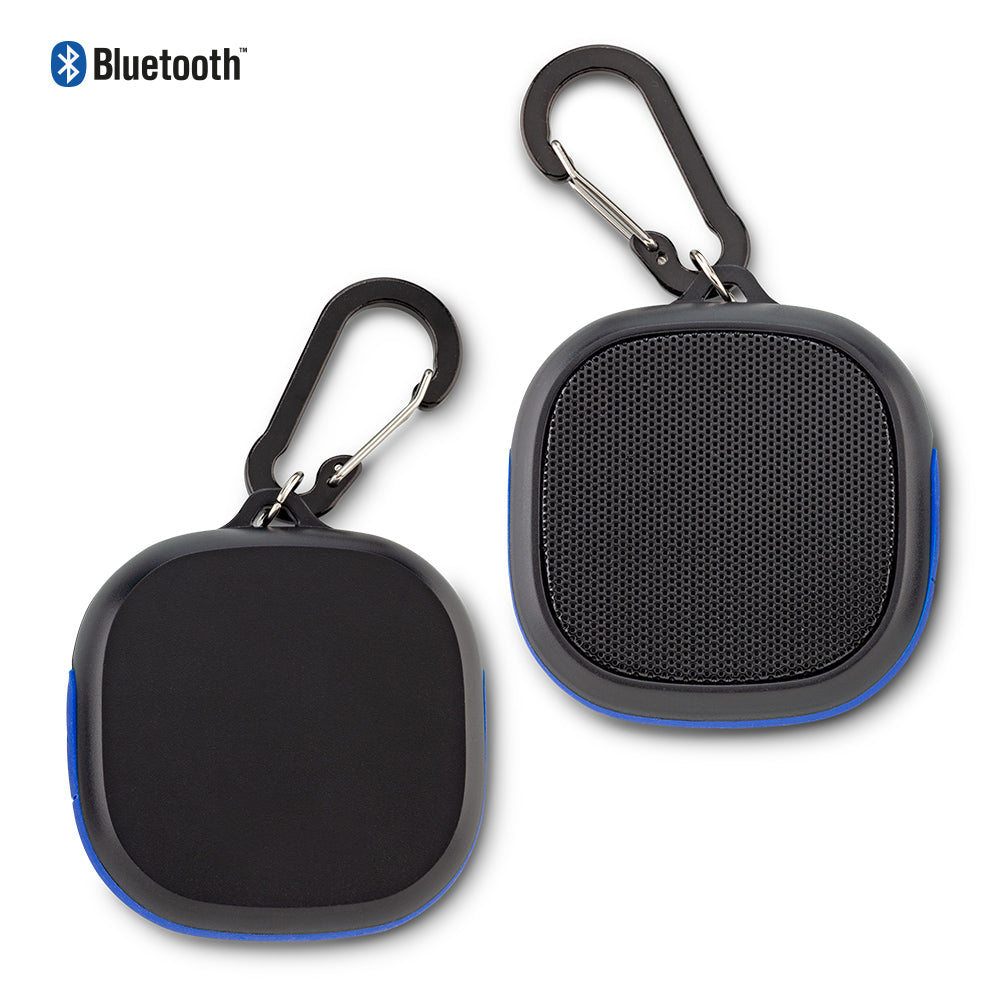 Speaker Bluetooth plastico de 3W con carabinero. Empaque caja individual. Medidas: 6.5 cm x 6.7 cm x 2.5 cm Marca: 4 cm Tampografia
