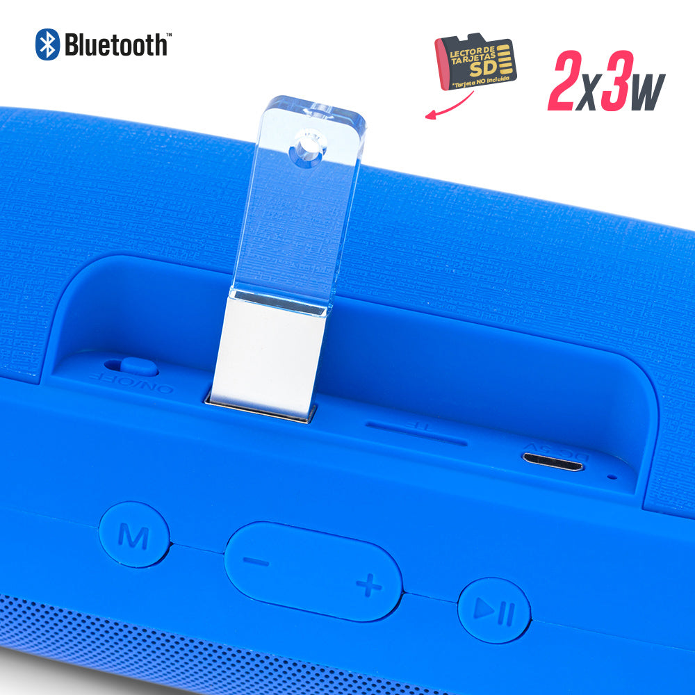 Speaker bluetooth plástico con acabado caucho, 2x3W, Lector de tarjeta SD y USB no incluidas. Potencia de salida: 2x3 W. Entrada: 5 V 0,5 A. Batería: 1200 mAh 3,7 V. Rango de frecuencia: 70Hz-18 KHz. Incluye placa metálica para marca. Empaque caja individual. Medidas: 17 cm x 7.5 cm x 7.5 cm Marca: 1.5 cm Láser Ficha Técnica