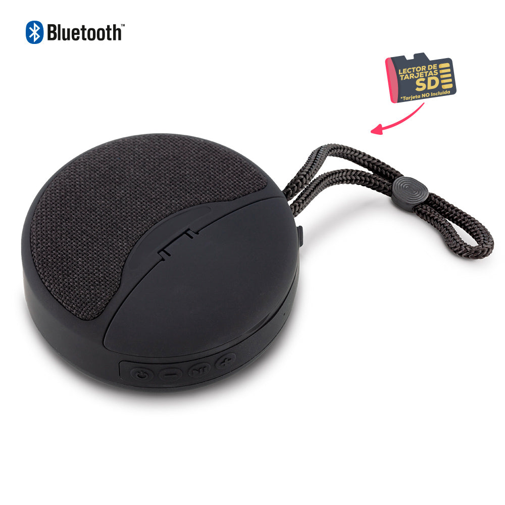 Speaker Bluetooth plástico de 3W con lector de tarjeta y USB no incluidas. Cuenta con audífonos bluetooth incorporados en la parte superior. Funciona como manos libres. Empaque Caja Individual. Medidas: 3 cm x 9.5 cm diámetro Marca: 3.5 cm Tampografía