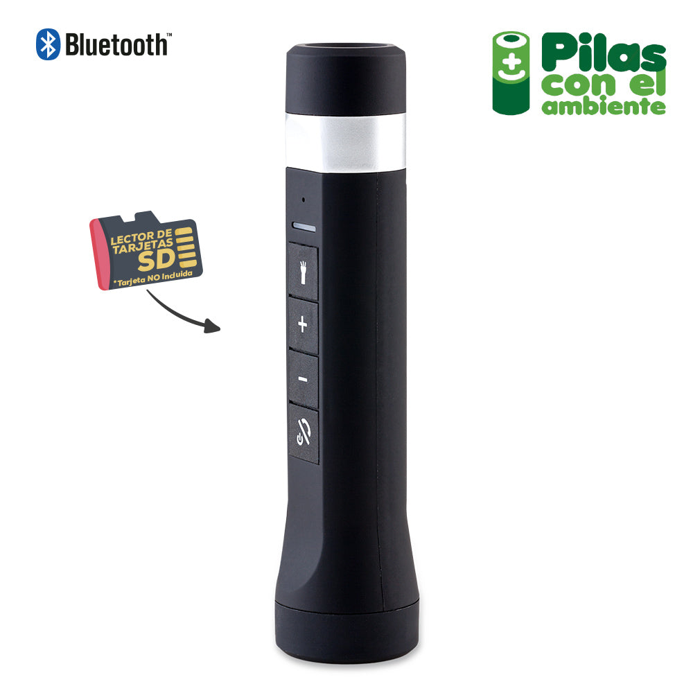 Speaker Bluetooth plástico de 2W, con pila recargable de 2000 mAh, linterna, lector de Tarjeta Micro SD tarjeta no incluida. Incluye cable y soporte ajustable. Empaque Caja Individual. Medidas: 15 cm x 3.6 cm diámetro Marca: 5 cm Tampografía Ficha Técnica