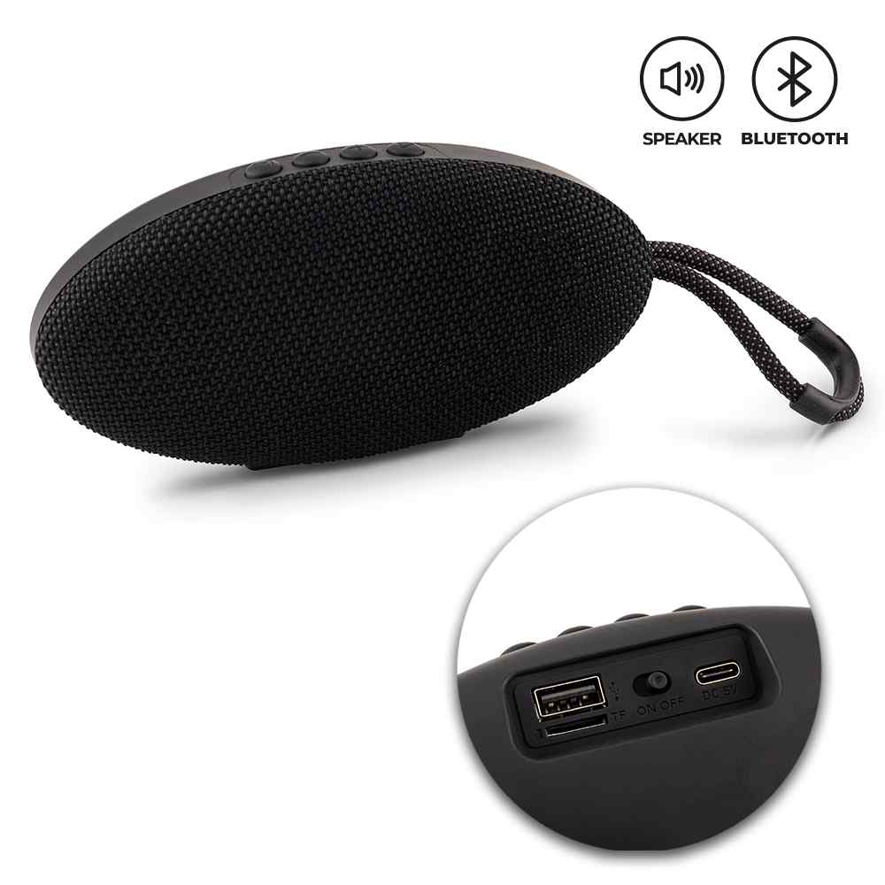 Speaker Bluetooth plástico recubierto en tela. Tiempo de reproducción: 3-4 horas. Batería: 1200 mAh. Potencia: 5W. Incluye cargador inalámbrico de 5W. Lector de tarjeta TF y USB no incluidas. Puerto Tipo C para carga. Empaque caja individual. Medidas: 10.8 cm x 8.2 cm diámetro. Marca: 4 cm Screen Láser. Ficha Técnica
