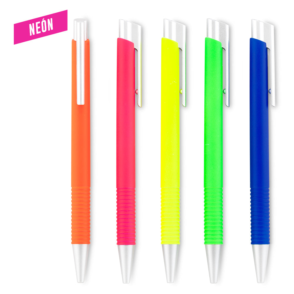 Bolígrafo plástico en colores neón. Medidas: 14 cm Marca: 2.5 cm Tampografía Venta mínima y en múltiplos de caja de 50 unidades por color.  Ficha Técnica
