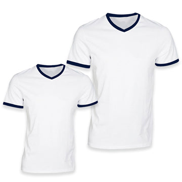 Camiseta blanca confeccionada en 100 algodón. Cuello en V con contraste azul oscuro en cuello y puños. Técnica de marca: Screen .. Ver lista de precios vigente