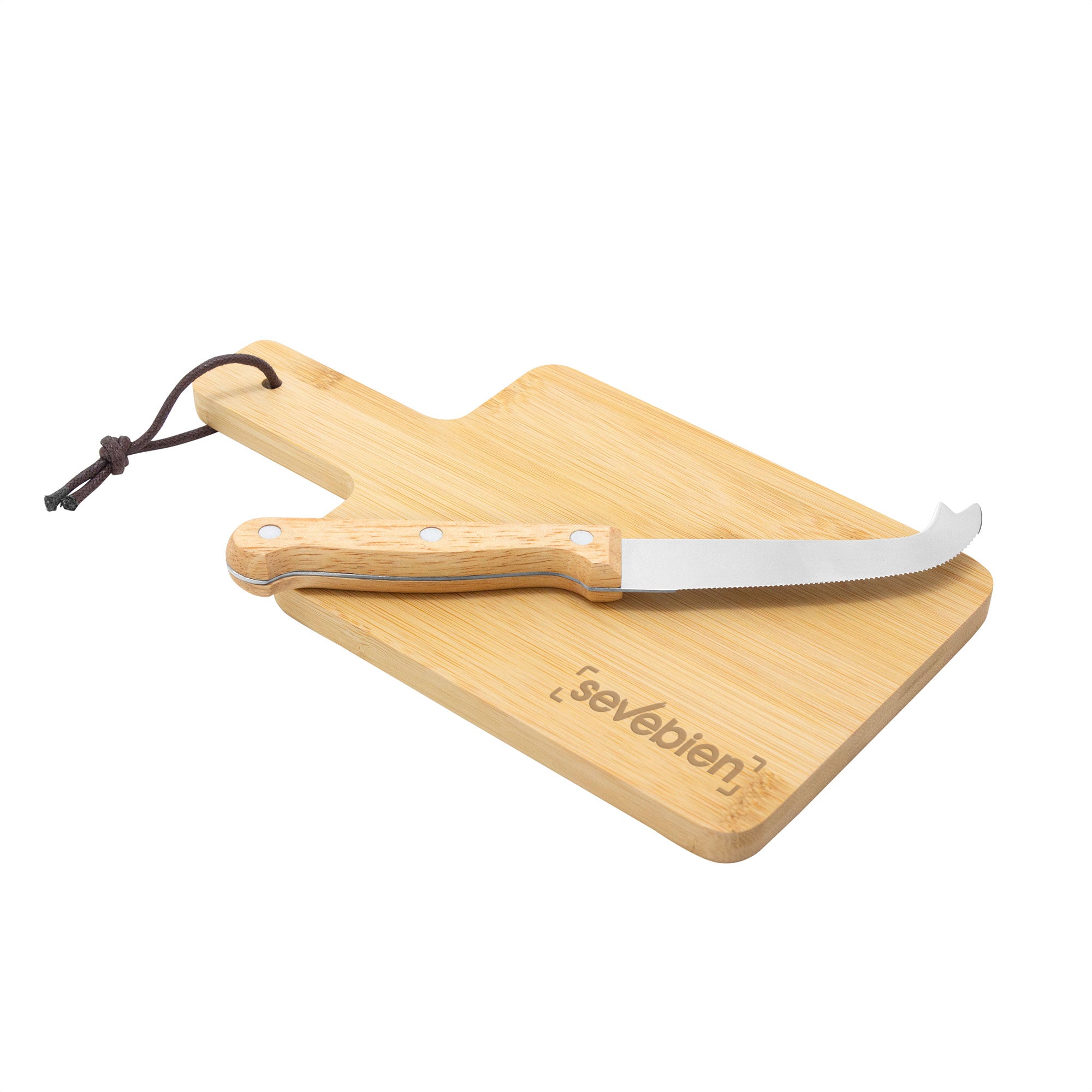 22 x 12 x 1,2 cm. Bambú Acero inoxidable. Set de tabla de corte para quesos y cuchillo. Tabla con recubrimiento de aceite vegetal y correa en el mango. Cuchillo de 19,5 cm de largo, de acero inoxidable 420 y mango de madera . Presentación en caja de regalo kraft.. Medidas Ancho: 27.5 . Medidas Alto: 37.0 . Medidas Profundidad: 46.5