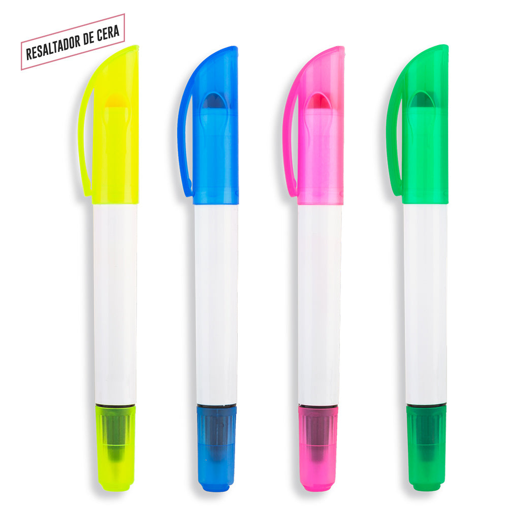 Bolígrafo plástico con resaltador de cera. No se seca. Medidas: 14.5 cm Marca: 3.5 cm Tampografía Venta mínima y en múltiplos de caja de 50 unidades por color.