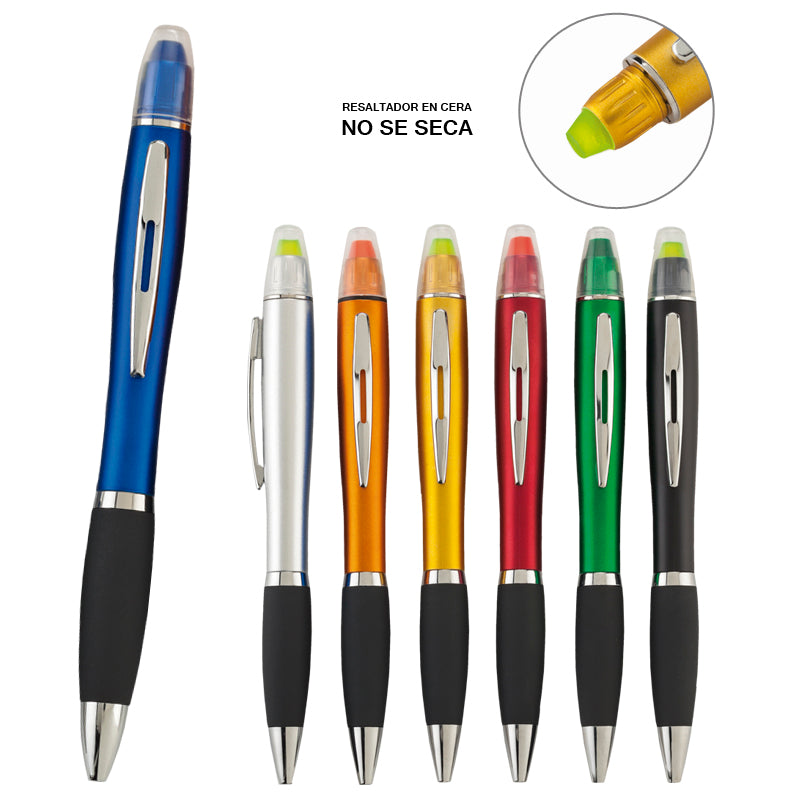Bolígrafo plástico con resaltador en cera y clip metálico. Mecanismo twist. No se seca. Medidas: 15 cm Marca: 3,5 cm Tampografía Venta mínima y en múltiplos de caja de 50 unidades por color.