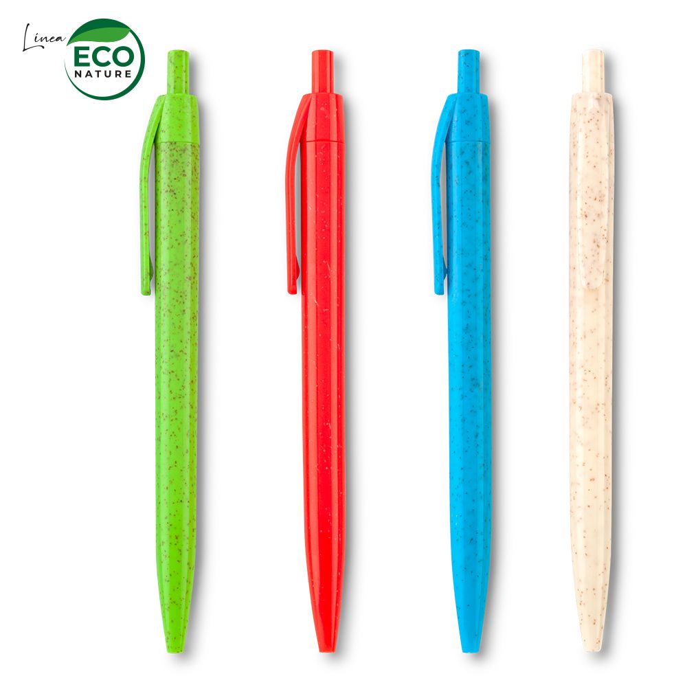 Bolígrafo plástico elaborado con fibra de trigo 50 aprox. El porcentaje de material ecológico tiene un promedio de biodegradabilidad de 2-3 años después del fin de su vida útil. Mecanismo push. Medidas: 14 cm Marca: 4 cm Tampografía Venta mínima y en múltiplos de caja de 50 unidades por color.
